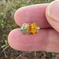 This bi-color Montana Sapphire pairs a striking light green with an intense orange, creating a vivid contrast that shifts as it moves through light. Cut by American cutter Barbara Thomas into a fancy elongated hexagon, it is designed to emphasize both color zones, allowing each to stand distinctly while still reading as a unified whole.