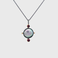 Pearl pendant: 15mm wide x 36mm tall on an 18 inch chain. Featuring a ~10mm Cortez Pearl® and two 3mm Grape Garnet® rounds.