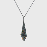 Pendant Specs: Crafted with oxidized sterling silver and 14k gold accents, this dual pendant piece features responsibly sourced gemstones donated by Columbia Gem House.