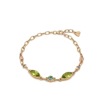 Product Details: This bracelet was handcrafted from 10k yellow gold made from SCS-certified recycled gold. It features a standard lobster clasp with a rustic texture and showcases Mesa Verde® Peridot, Montana Sapphire, Oregon Sunstone, and Yogo Sapphire. The bracelet can be easily adjusted to fit snugly at 6.25 inches or extended up to 8 inches for a more relaxed fit.
