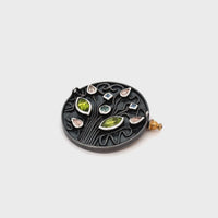 Versatile in design, the piece can be worn as a pendant, pin, or brooch and features a removable blackened 925 silver pin and chain, accented with 22k gold granules. Crafted using wax carving and lost wax casting, this one-of-a-kind design symbolizes togetherness and showcases gemstones including Mesa Verde® Peridot, Montana Sapphire, Oregon Sunstone, and Yogo Sapphire. Each stone is set in a hand-built wax bezel with intricate wax wire filigree details that enhance the floral style. After casting, the gems were set using a bezel technique with a high-polish finish, and the blackened background creates contrast to highlight the vibrant jewels.